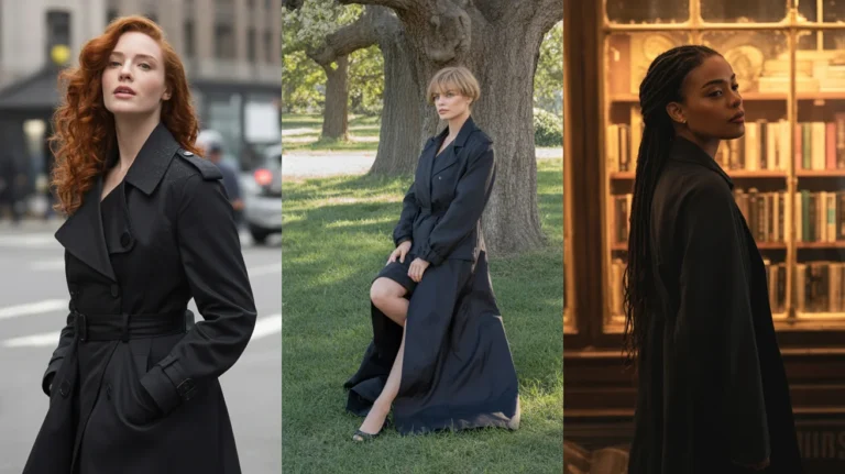 A sleek long black coat over a crisp white tee. Pair it with form-fitting black leggings for a streamlined look. Finish the ensemble with chunky white sneakers and classic white socks for ultimate comfort and style. Don’t forget those chic black sunglasses and a headband for a touch of flair.