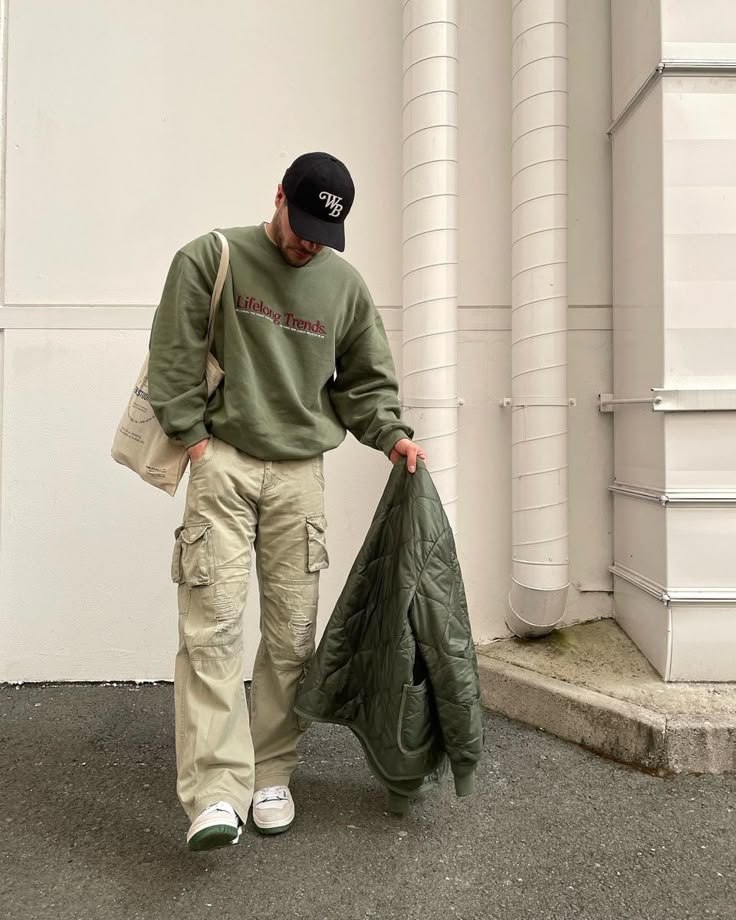 This laid-back streetwear look brings together comfort and cool in one simple combo. The man pairs baggy khaki cargo pants with an oversized olive green sweatshirt that reads “Lifelong Trends,” keeping things casual yet intentional. A black baseball cap adds contrast, while white sneakers keep it fresh from the ground up. The quilted army-green jacket in hand hints at colder weather, while the tote bag slung over the shoulder adds a touch of everyday practicality. Everything about this outfit says relaxed confidence—without trying too hard.