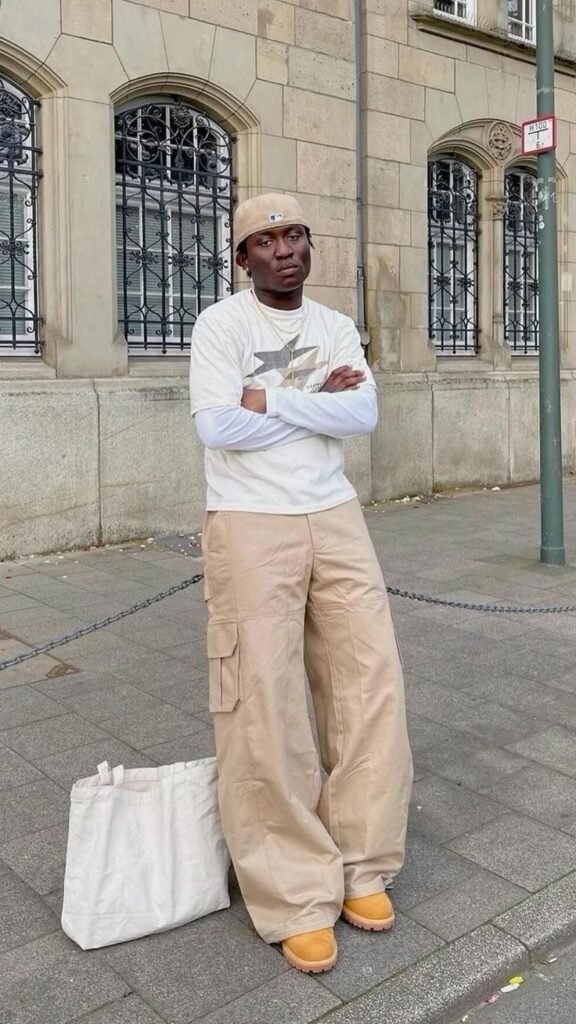 Muted tones bring big energy in this effortlessly cool streetwear look. The wide-leg khaki cargo pants give a relaxed silhouette, while the white graphic tee over a long-sleeve base layer adds subtle layering. A backward beige cap and statement Timberland-style boots tie everything together with laid-back confidence. This outfit nails the balance between oversized and structured, giving off quiet confidence without trying too hard. A white canvas tote adds practicality and keeps the color palette fresh.